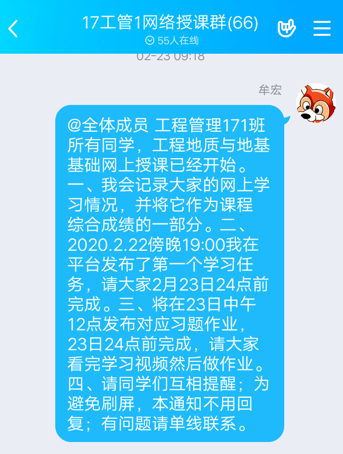 此外,还建立了班级网课QQ群,班上所有学生和任课老师(包括班主任)都在群里,以便教学信息同步分享和教学管理沟通。