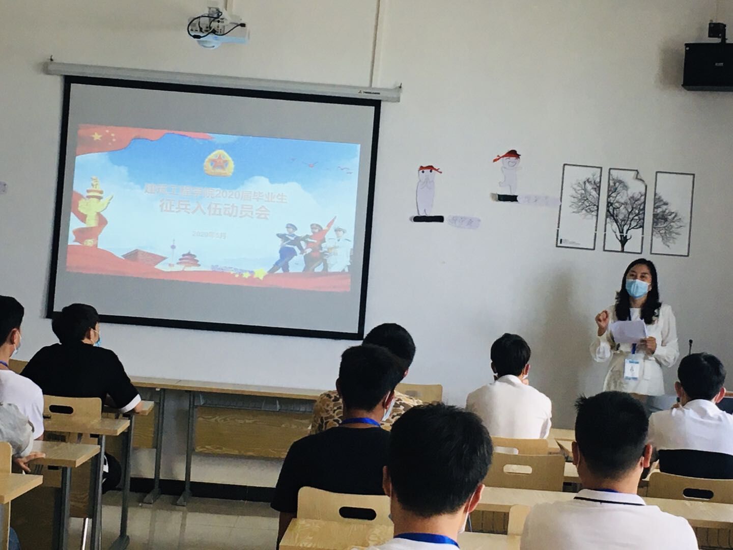 课后,学院还针对返校毕业生召开了征兵动员会。动员会上,杨泰黔副书记传达了今年的征兵政策,为大家算了参军入伍的“三笔账”,即:经济账、成长账和政治账,动员建工的热血男儿积极响应国家号召参军入伍、从戎报国。动员会上还学习宣传了刚刚下发的直招士官政策,鼓励同学们积极报名参加。