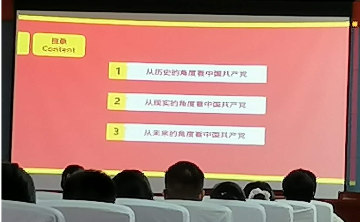 唐书记结合四史(党史、新中国史、改革开放史、社会主义发展史),从历史的角度讲述了中国共产党苦难的辉煌以及如何在艰难中探索、发展壮大;从现实的角度结合我国的外交、以及今年取得瞩目成绩的抗疫阻击战,看中国共产党强有力的领导;从未来的角度探索我辈党员应该努力的方向。讲座结束时,唐建荣书记带领各位党员同志回顾了教育的初心,指出“中国高等教育的初心和使命就是为党育人,为国育才,办好人民满意的高等教育”。