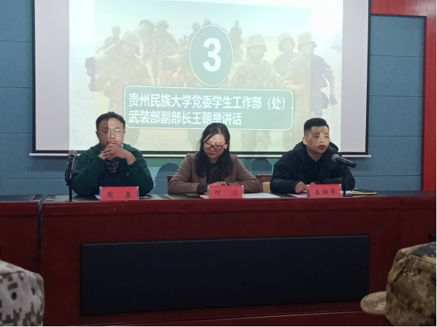 党委学生工作部、武装部副部长王朝举讲话。王朝举副部长首先向同学们报告应征入伍的利好消息以及讲述了国防的重要性,并指出“只有每个中华人民都积极投身国防,我们的长城才能屹立不倒”的观念。利好消息主要有两个方面:第一,从经济方面来说,入伍的同学可以享受到学费补偿和国家助学贷款代偿,还可以享有地方政府的补助和奖励,服役期间还有优待金(各个地方不同),退役后有退役金;第二,从成长账方面来说,主要体现在毕业优待(可免毕业设计、挂科帮扶)、学业优惠、就业优待、政治优待(军人家属医疗免费等)。王副部长告知学校准备组建2022年入伍“预征班”并鼓励大家积极报名。