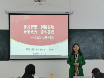 党委书记何璘同志以《怀抱梦想 脚踏实地 敢想敢为 善作善成》为主题,在建工楼A401教室为21级建筑学专业1班学生宣讲党的二十大精神。