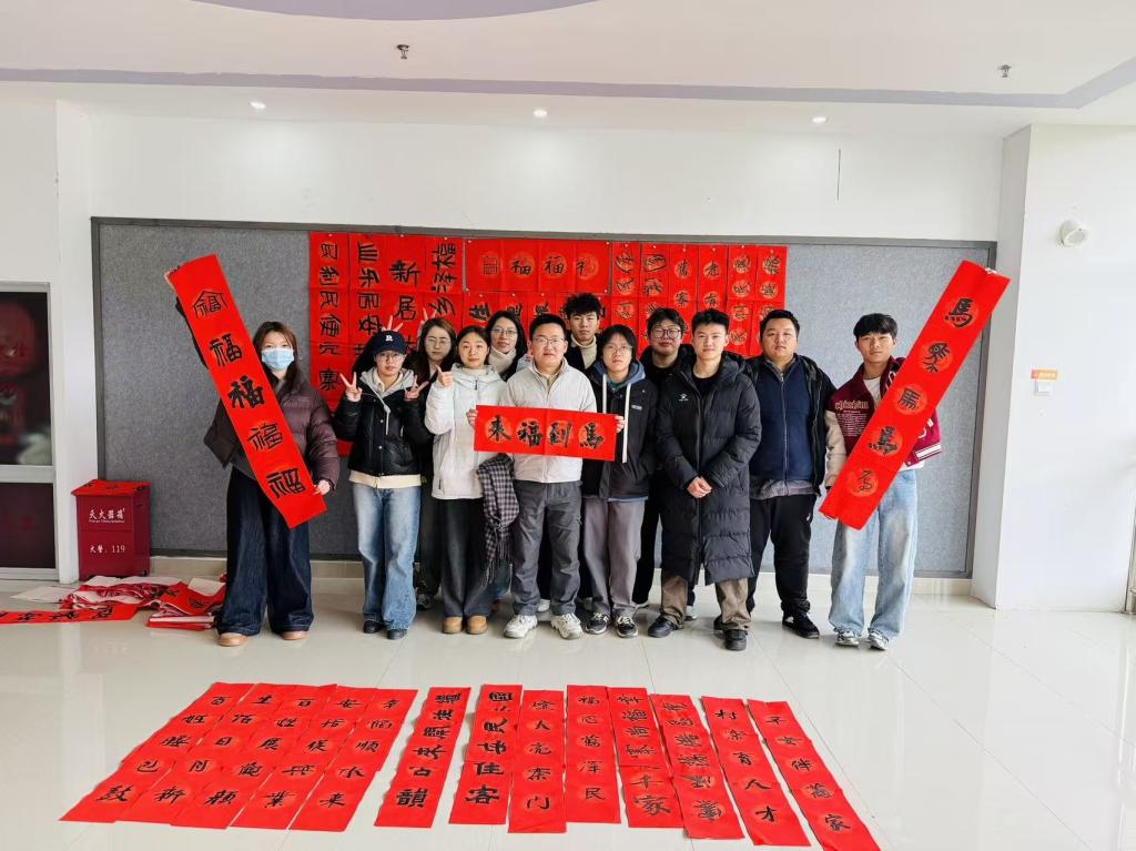美术学院邓宇老师带领学生精心书写的260副对联整齐陈列,这些作品或苍劲有力、或飘逸灵动,既有“天增岁月人增寿,春满乾坤福满门”的传统佳句,也有“乡村振兴开新局,民族团结谱华章”的时代新篇,充分展现了中华书法艺术的魅力,也体现了高校服务地方、文化下乡的责任担当。