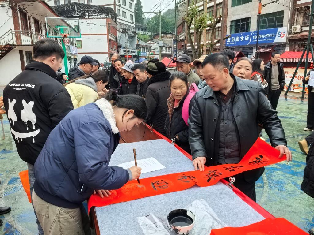 二是现场书写定制春联。活动特别邀请了尚寨土家族乡党委领导班子成员、美术学院研究生以及当地乡贤代表亲临现场,根据群众个性化需求挥毫泼墨。乡领导班子成员带头书写,与群众亲切交流,送上新春祝福;研究生们执笔耕耘,将知识的情怀融入笔墨;乡贤们则结合乡土文化,创作了一幅幅充满地方特色的春联。现场墨香四溢、人头攒动,前来领取春联的群众络绎不绝,欢声笑语中洋溢着浓浓的年味。
