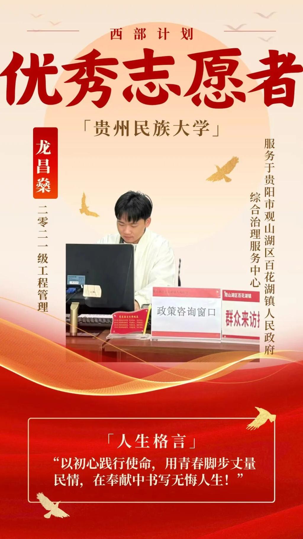 2021级工程管理专业毕业生,现服务于贵阳市观山湖区百花湖镇人民政府综合治理服务中心。在西部计划服务期间,他积极参与基层信访工作,耐心倾听群众诉求,协助化解矛盾纠纷、解读政策法规,在实践锻炼中提升了群众工作能力。同时,他认真负责信访材料的撰写、整理与流转,以严谨细致的作风保障工作规范高效。半年多的基层服务,让他深切体会到治理之艰、为民之重,也在奉献中进一步坚定了初心。他始终相信:“以初心践行使命,用青春脚步丈量民情,在奉献中书写无悔人生。”