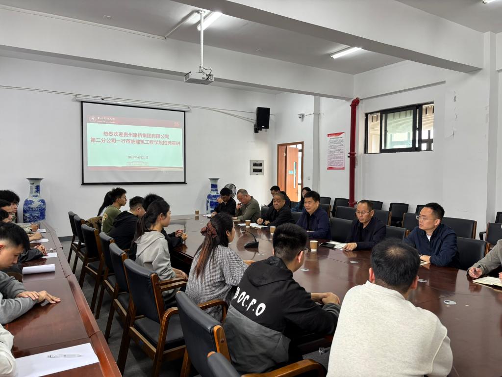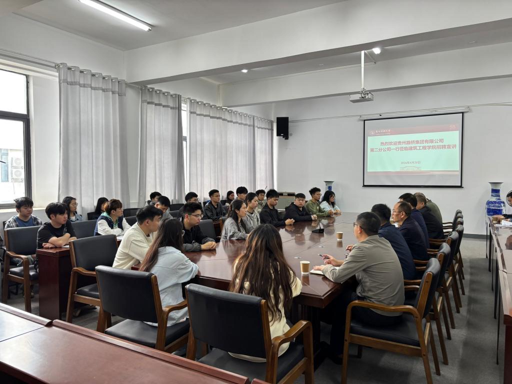 在会议室成功举办贵州路桥集团有限公司第二分公司 2026 届毕业生专场招聘宣讲会。学院党委副书记陆忠婷、学生工作办公室主任乐筑怡,贵州路桥集团有限公司第二分公司相关负责人出席本次活动,学院 2026 届土木工程、工程管理、城乡规划、建筑学专业毕业生参会。