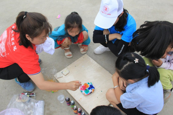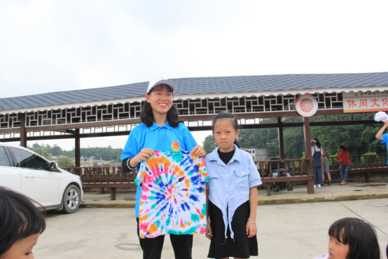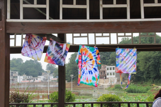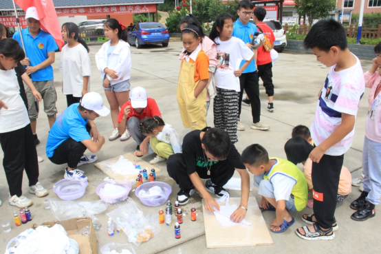活动中,志愿者们一边耐心地向小朋友们讲解扎染方法,一边示范演示指导。折叠、扎紧、喷染……孩子们听得聚精会神,跃跃欲试。随后,在志愿者的指导下,小朋友们戴上手套,开始了他们的创作之旅。他们先用冷染增艳剂将要扎染的衣服浸泡3-5分钟,拧干。然后按照自己心中的想法,将衣服捆扎造型,上染料。在扎染过程中,孩子充分发挥自己的想象力和创造力,用自己智慧的双手扎出独特的造型。通过不同的技法,有的呈现水波纹形状,有的是菱格形状,有的呈现蜘蛛网状,还有的呈现不规则形状……当孩子们拆开布团后,看到自己染出了绚丽多彩的作品时,脸上洋溢着成功的喜悦和快乐。小朋友们将自己的扎染作品进行展示,一件件五彩斑斓的小作品成了夏日刘庄一道美丽的风景线。